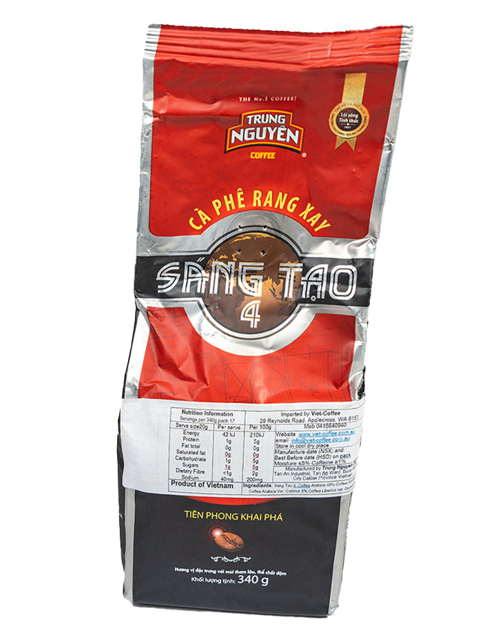 Creative Coffee #4 (also known as Sang Tao 4) is blend of culi (single, unsplit) beans of Arabica, Robusta, Chari and Catimor. Strong, deep, dark and complex. The quintessential coffeehouse favorite making a strong full flavoured coffee typically Vietnamese in style