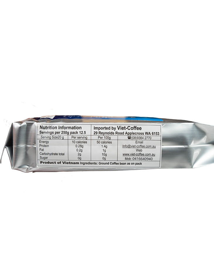 A blend of the best Arabica, Robusta coffee beans, roasted to maintain the natural aroma. This Viet-Coffee product is very good value, very good tasting Vietnamese ground coffee just right for Australia. Mr Coung specially selects all his coffee beans from the highland coffee region of Vietnam and we bring it to you in Australia. No longer in box now in foil packs